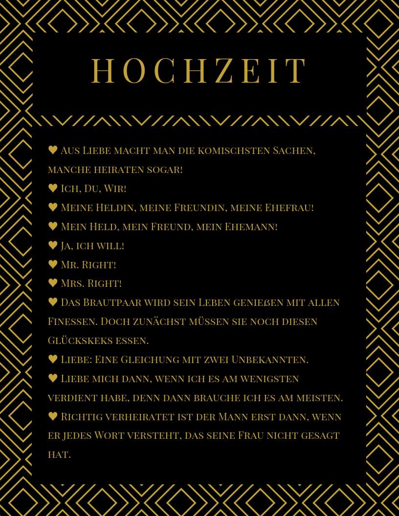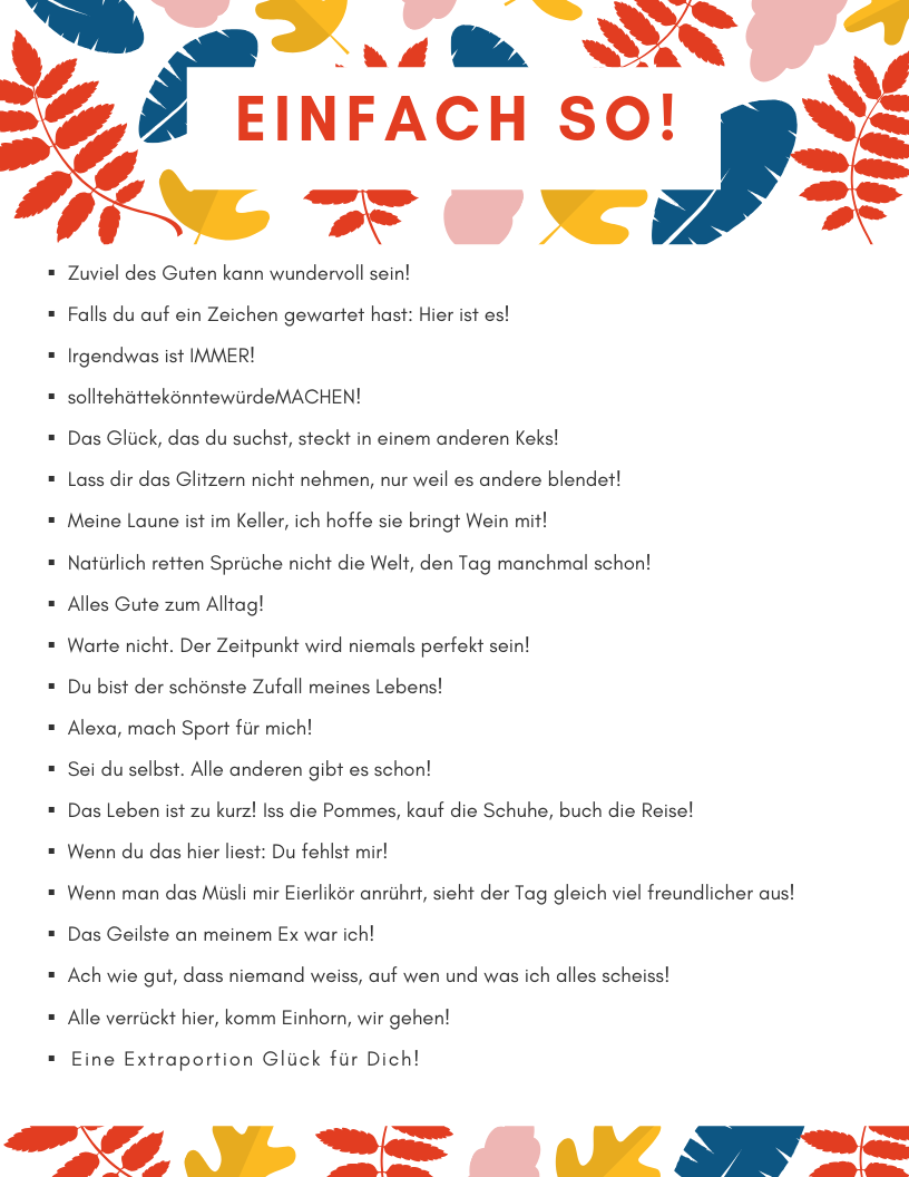 Du suchst anhand der Spruchlisten den passenden Spruch aus, diesen bitte während des Bestellvorganges dazuschreiben. Wenn kein passender Spruch dabei ist, kannst Du mir gerne Deinen Wunschtext mitteilen.